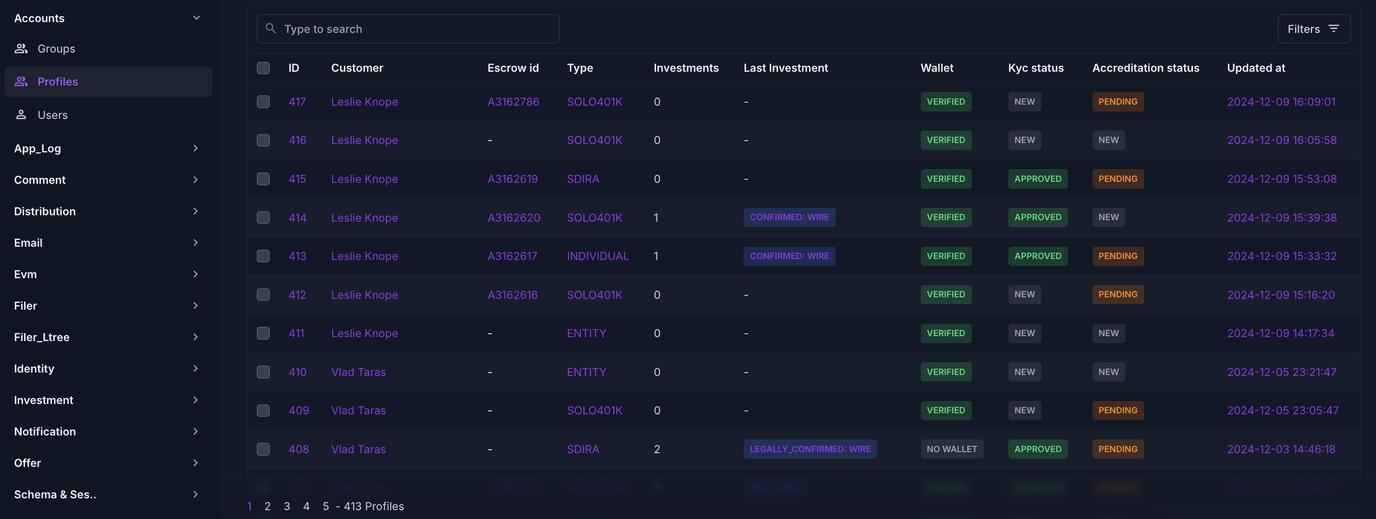 Profiles,Offers, orInvestments—takes you to a dedicated section for managing that type of data.The Main Content Area: On this main dashboard page, you will see a list of all the data models you have permission to view, grouped by their function.